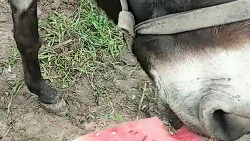 就在村民们品尝西瓜的当天,老驴不知为何突然闯进了村民的地里。它看到那片诱人的西瓜,竟然忍不住伸长脖子,用嘴巴去啃。村民们见状,都惊呆了,没想到这头老驴竟然会吃瓜!